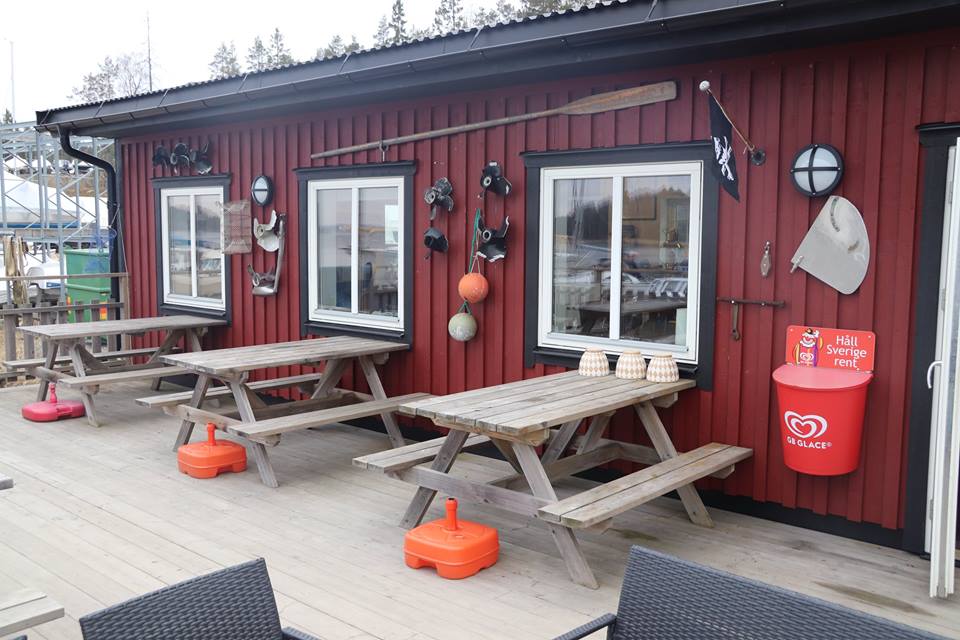 I vår butik kan du köpa fika och glass för att sitta en stund i solen på vår veranda och titta ut över vattnet.