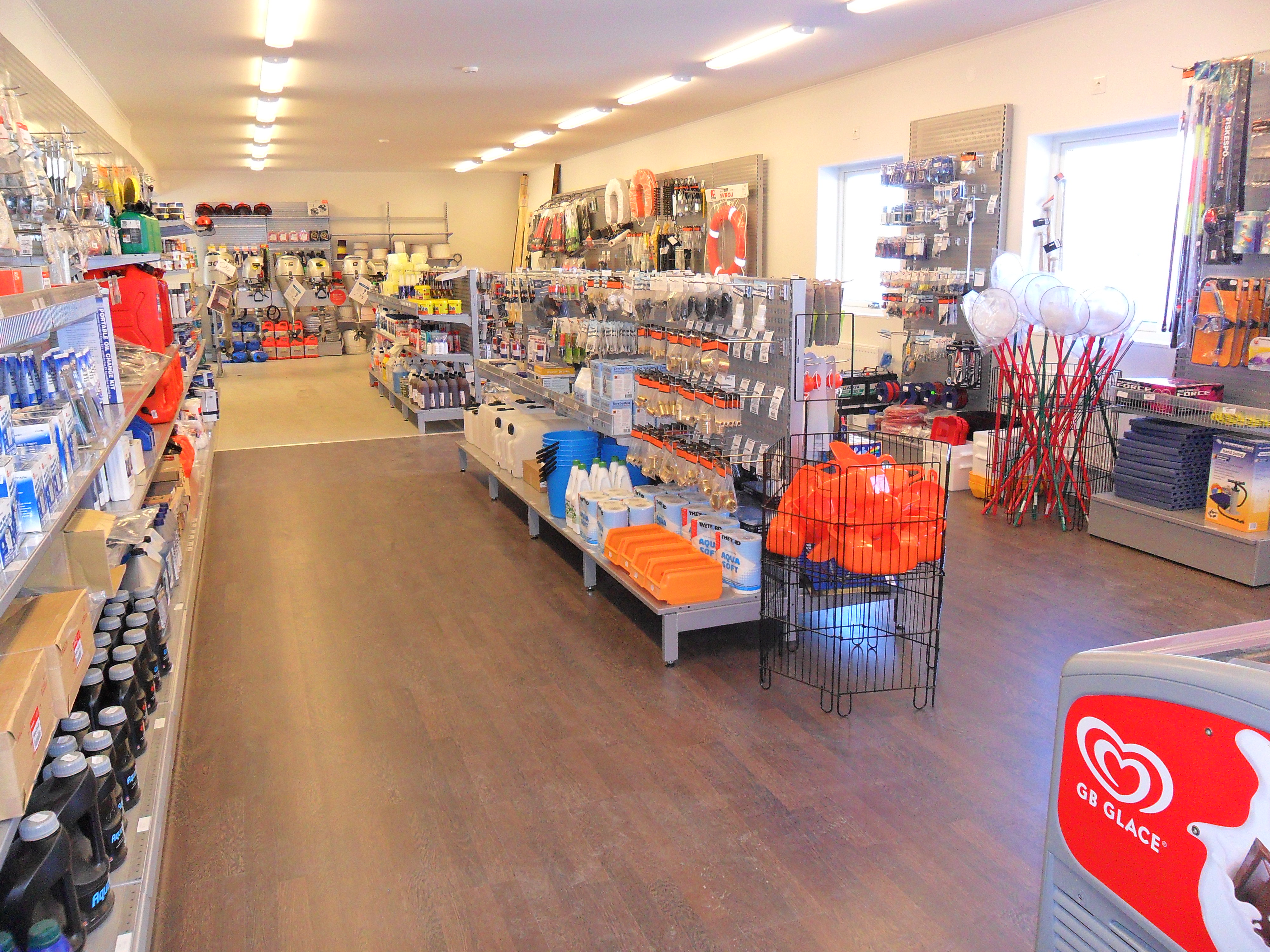 I butiken säljer vi båttillbehör, båtmotorer och Husqvarna trädgårdsmaskiner.